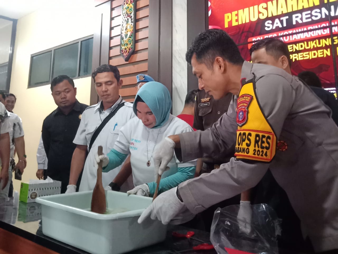 Kegiatan pemusnahan barang bukti ini dipimpin langsung oleh Wakapolres Kotim Kompol Tri Wibowo, dan dihadiri Perwakilan BNK Kotim, Perwakilan Pengadilan Negeri Sampit, Perwakilan Kepala Kejaksaan Negeri Kotim, UPTD Labkesda Kotim, serta Perwakilan Tokoh Masyarakat Anti Narkoba.