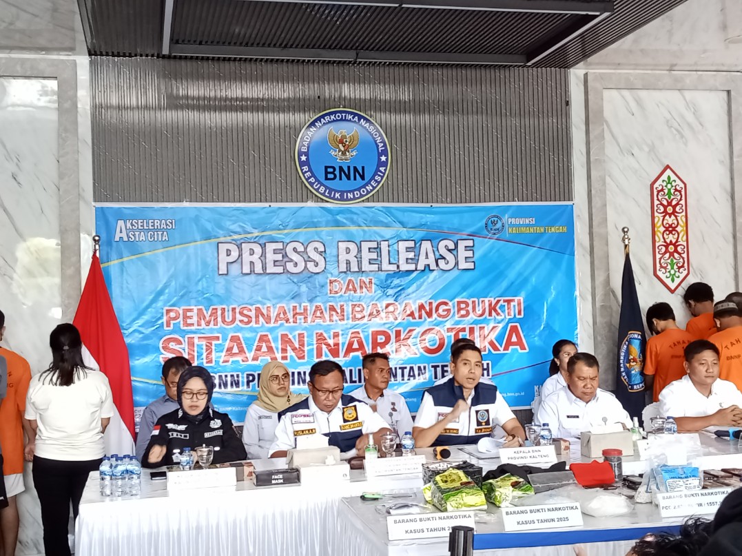 PALANGKA RAYA – Badan Narkotika Nasional Provinsi (BNNP) Kalimantan Tengah menggelar press reliase pemusnahan barang bukti hasil pengungkapan akhir Tahun 2024 dan awal Tahun 2025. Acara berlangsung di Aula Kantor BNNP Kalteng Jalan Tangkasiang, Kota Palangka Raya, (23/12/2024) Pagi.