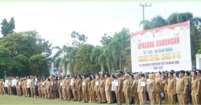 PALANGKA RAYA – Pemerintah Kota Palangka Raya menggelar Upacara Gabungan Peringatan Hari Lahir Pancasila di halaman Kantor Wali Kota Palangka Raya, Senin (02/6/2025).
