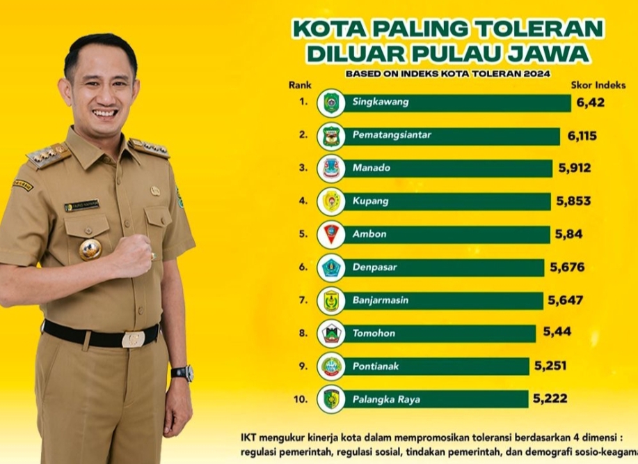 Meskipun Kota Singkawang menempati posisi teratas dengan skor 6,42, posisi Palangka Raya yang berada di peringkat ke-10 tetap menjadi bukti bahwa kota ini terus menunjukkan performa unggul dalam hal toleransi dan keberagaman.