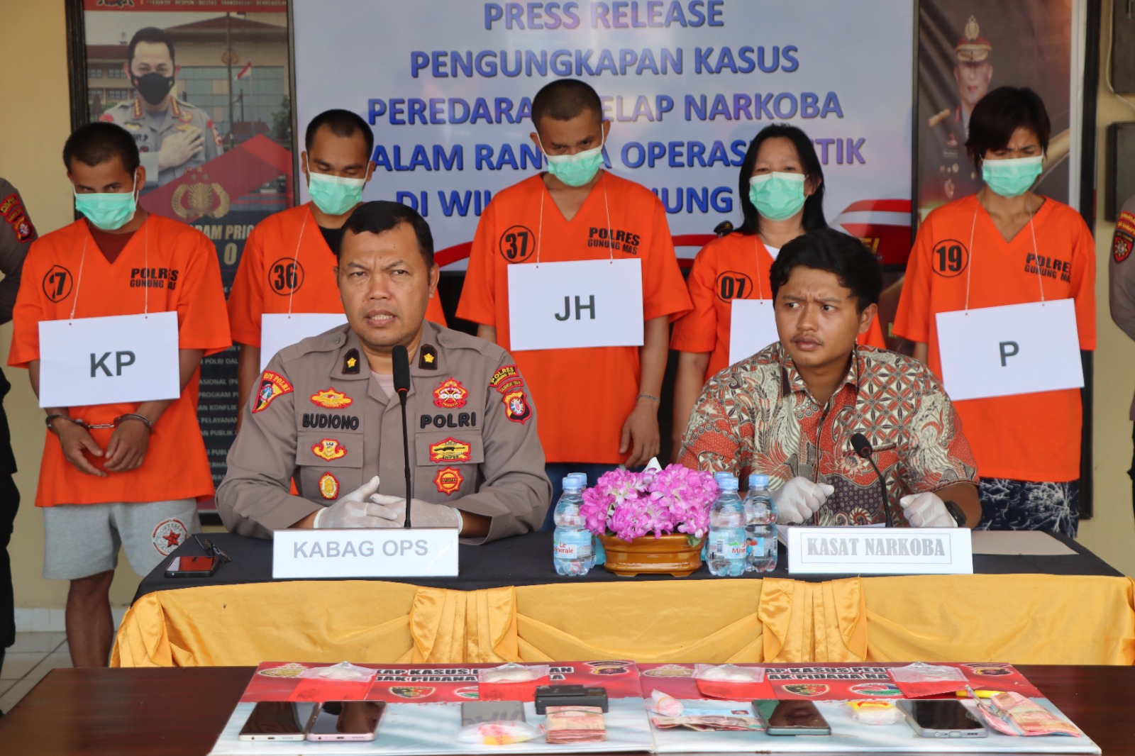 Hasil signifikan dari operasi khusus ini dipaparkan secara resmi dalam konferensi pers yang digelar di lobi utama Polres Gunung Mas. Konferensi pers tersebut dipimpin oleh Kepala Bagian Operasi (Kabag Ops) Kompol Budiono, yang didampingi oleh Kasat Reserse Narkoba, Iptu Abi Wahyu Prasetyo, S.I.K., M.H. Keduanya mewakili Kapolres Gunung Mas, AKBP Heru Eko Wibowo, S.I.K., M.H.