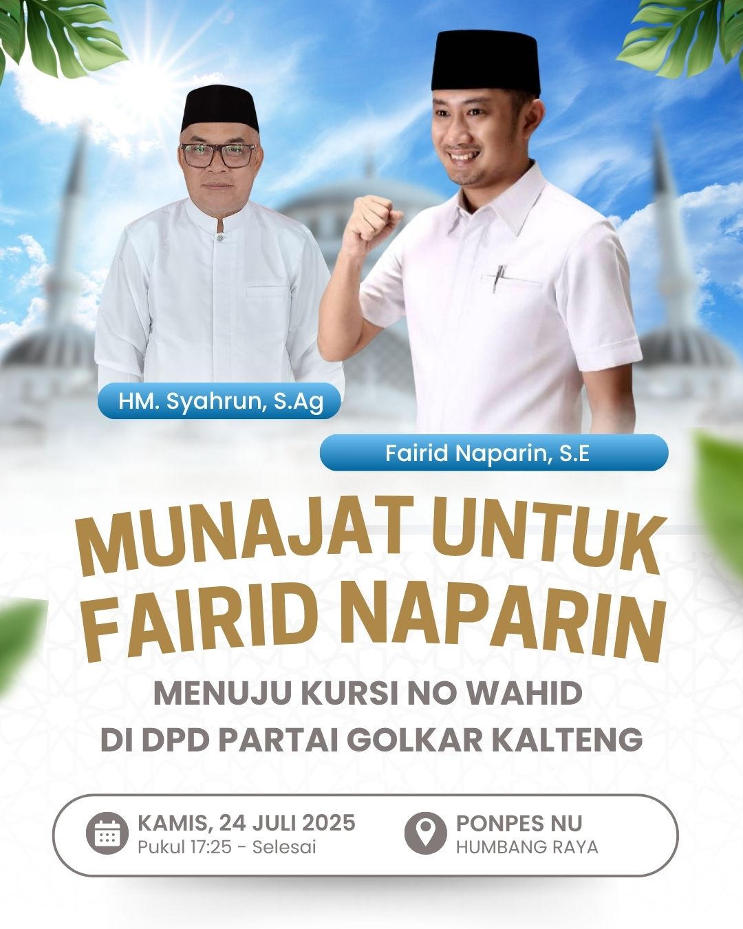 Munajat yang digelar di salah satu pesantren NU di Kota Palangka Raya tersebut dihadiri oleh para kyai, tokoh agama, tokoh muda NU, serta kader Partai Golkar. Dalam doanya, Syahrun berharap agar Fairid Naparin diberi kekuatan, keikhlasan, dan kebijaksanaan dalam membawa Partai Golkar menjadi partai yang berpihak kepada rakyat dan mendukung pembangunan daerah.