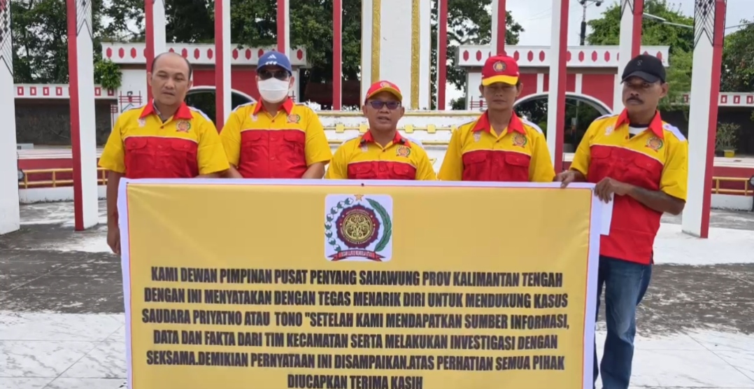 “Kami Dewan Pimpinan Pusat Penyang Sawung Provinsi Kalimantan Tengah dengan ini menyatakan dengan tegas menarik diri untuk mendukung kasus saudara Priyanto atau Tono, setelah kami mendapatkan sumber informasi, data dan fakta dari tim kecamatan serta melakukan investigasi dengan seksama. Demikian pernyataan ini disampaikan atas perhatian semua pihak. Terima kasih,” demikian bunyi pernyataan dalam video tersebut.