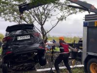 Personil Ditsamapta Polda Kalteng Sigap Bantu Evakuasi Mobil Terbalik di Jalan Soekarno